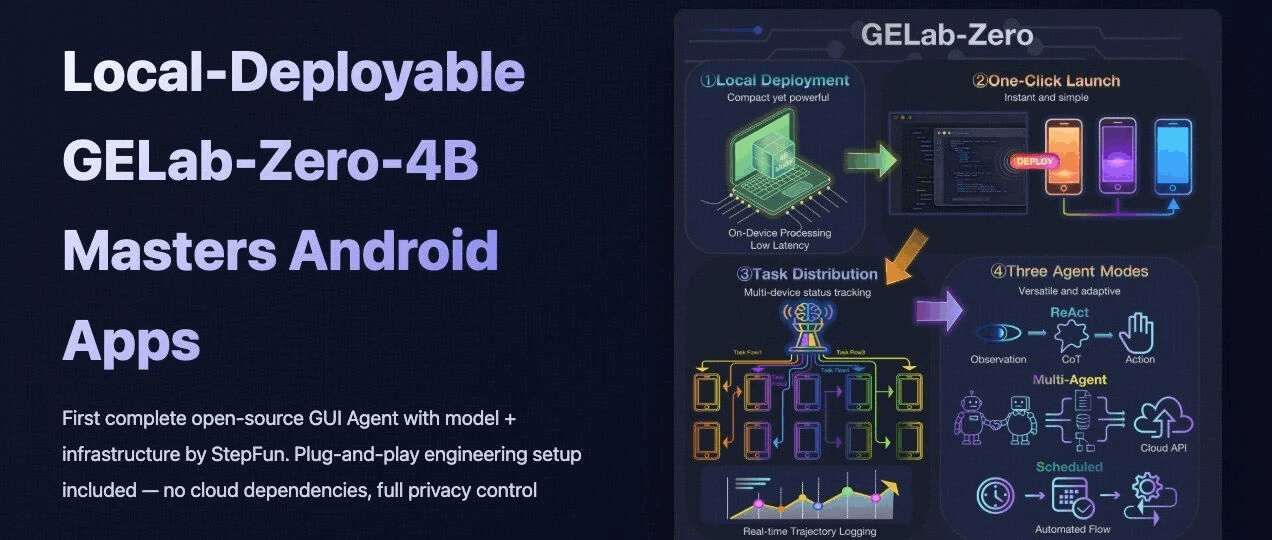 阶跃星辰重磅开源 GELab-Zero ,首次将 GUI Agent 模型与完整配套基建同步开放,支持手搓党一键部署。其中 4B GUI Agent 模型在手机端、电脑端等多个 GUI 榜单上全面刷新同尺寸模型性能纪录,取得 SOTA 成绩。此外,阶跃此次还开源了基于真实业务场景的自建评测标准 AndroidDaily,以期推动 GUI 领域模型评测向消费级、规模化应用发展。 开源链接 GitHu