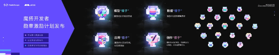 大会主论坛正式发布了魔搭开发者勋章激励计划,为在平台上作出贡献的开发者赋予荣誉和奖励,激励开发者持续成长。未来,魔搭开发者勋章激励计划还将面向代码搭子、布道搭子等开发者贡献群体开放,同时也会推出针对社区活跃行为的勋章激励。