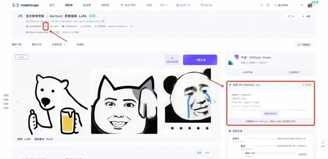'model': 'DiffSynth-Studio/FLUX.1-Kontext-dev-lora-highresfix',#ModelScope Model-Id,required