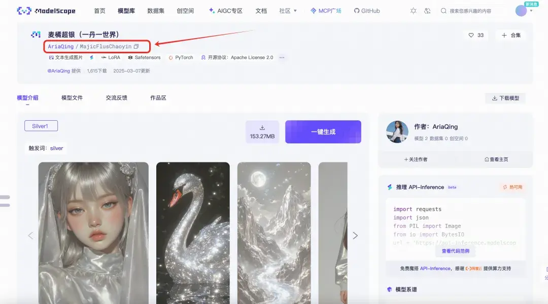 首先在魔搭AIGC专区模型库中选中一个模型,例如我选中“麦橘超银”模型,把模型ID复制下来