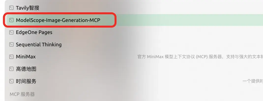 | ModelScope-Image-Generation-MCP地址:https://modelscope.cn/mcp/servers/@modelscope/ModelScope-Image-Generation-MCP |