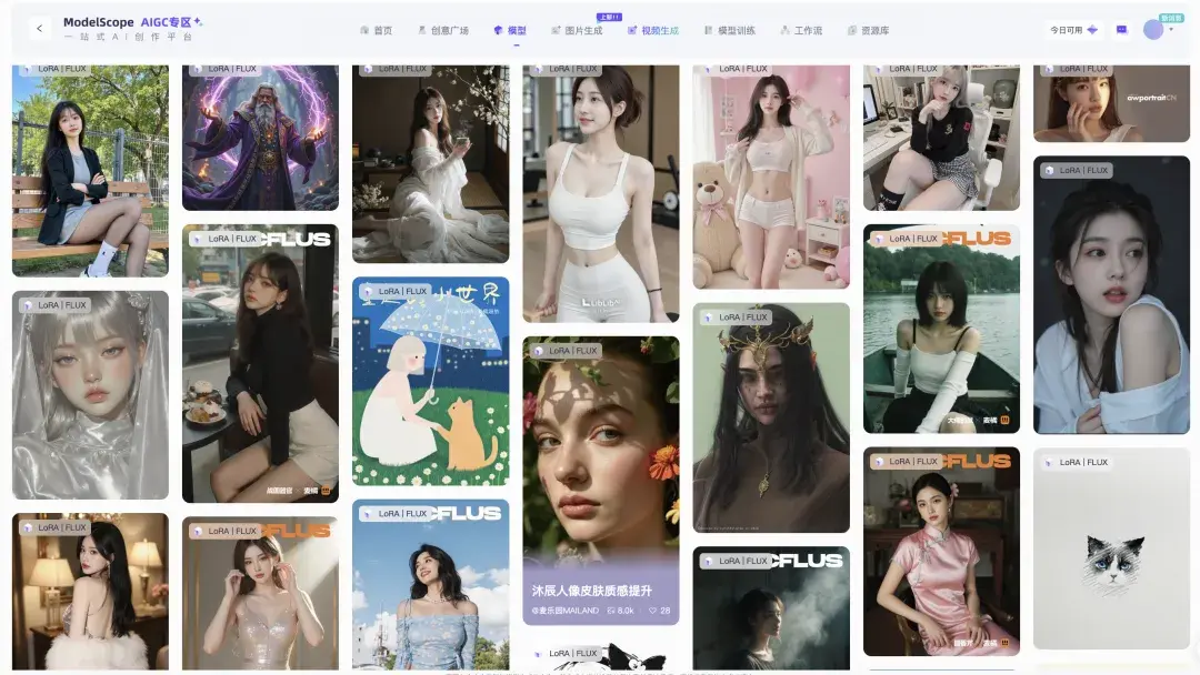 魔搭社区的AIGC专区很早就支持了Flux的LoRA训练,截止到目前为止,基于Flux架构的衍生LoRA已经有1万多个。这些模型除了在AIGC专区的在线生图可以直接推理之外,魔搭也使用云资源部署了API-Inference服务,提供了API接口供开发者免费调用。