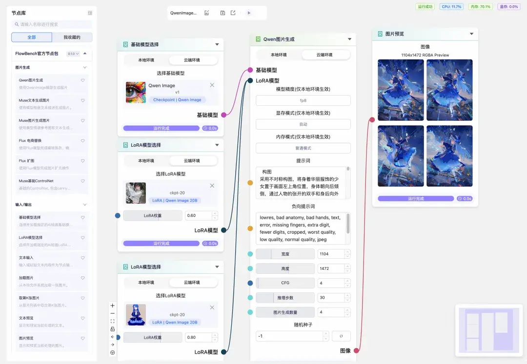 本次FlowBench发布公测的核心功能围绕QwenImage图像生成模型打造,原生支持Qwen图片生成节点。Qwen图片生成节点同时支持<本地环境><云端环境>两种模式,可以混合使用本地与云端资源,云端资源与魔搭AIGC专区算力额度共享。围绕Qwen图片生成节点,FlowBench团队发布了2个示例工作流供大家一键体验,分别是云端多LoRA生图工作流和本地生图工作流。
