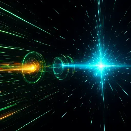 翻译:量子粒子加速器内部的粒子碰撞可视化,绚丽的粒子轨迹和能量波动,深色背景突出光效,未来感与学术感兼具