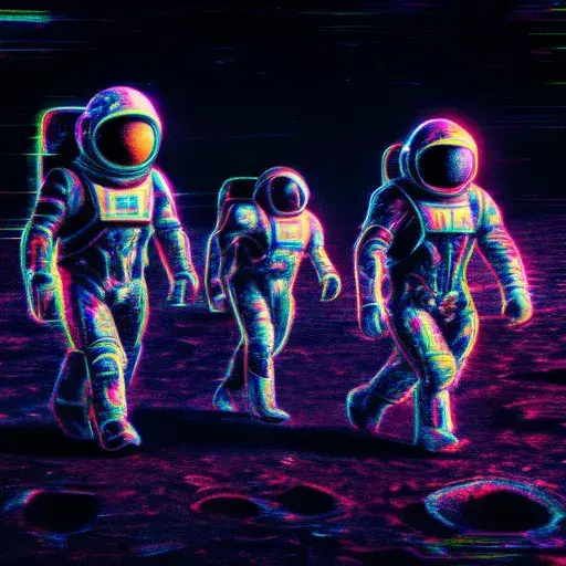 提示词:Astronauts walking on the moon, cyberpunk style, neon colors, glitch art effects, futuristic mechanical texture, dark background with glowing details(宇航员走在月球,赛博朋克样式,氖颜色,小故障艺术效果,未来派机械纹理,与发光细节的黑暗背景)