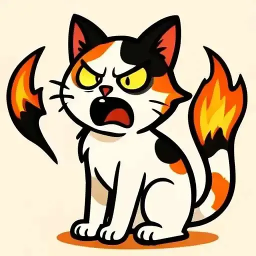 提示词:Goofy cartoon-style calico cat, white with orange and black patches, eyes blazing with fire, furrowed brows, ears pinned back, tail puffed like a brush, mouth wide open as if shouting