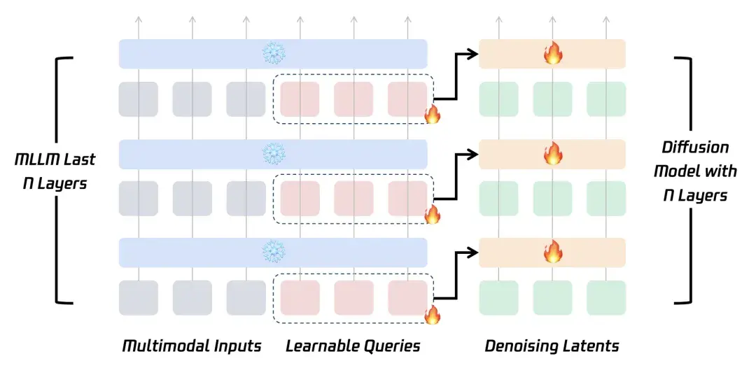 - 深层绑定,细节不丢:它让扩散模型像“爬梯子”一样,接住大语言模型多层的“理解结果”。比如 MLLM 的第5层、8层、10层输出都给 DiT 当参考——相当于生成过程全程盯着“文字的深层逻辑”,连“氛围感”“朦胧感”这种抽象描述都能拆解成具体画面元素;