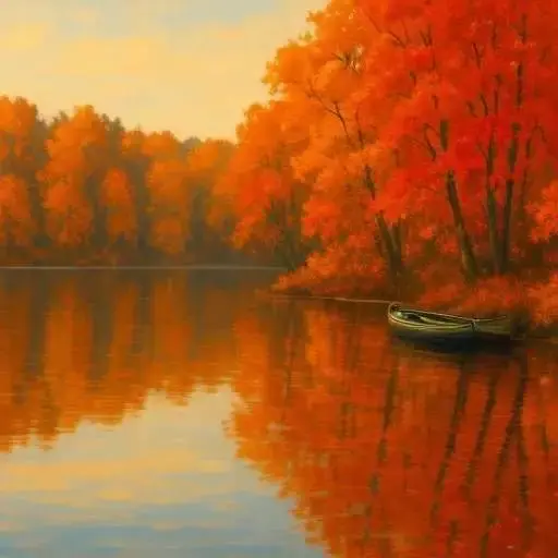 提示词:An autumn lakeside scene, golden and red maple leaves reflecting on the water, a small boat quietly moored(湖畔的秋日景色,金黄与红色的枫叶倒映在湖面,小船静静停泊)