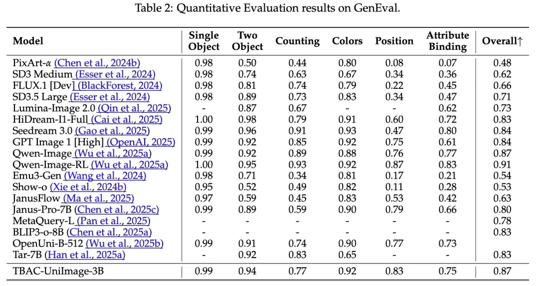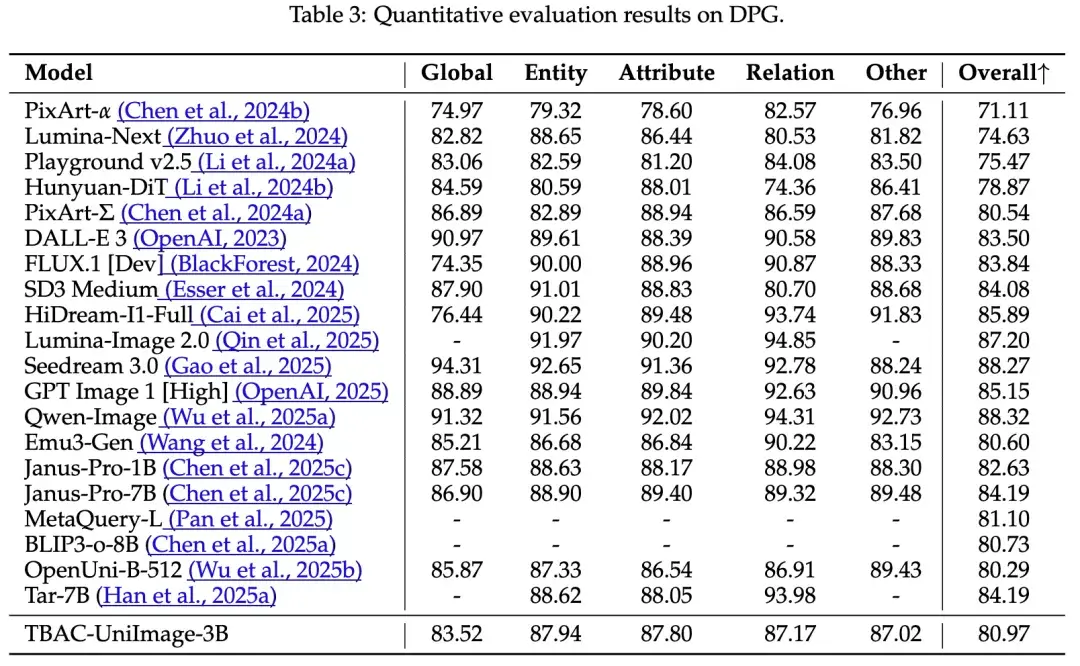 - 省钱能打:大语言模型的参数直接“冻结”不用动,只训练少量“可学习查询”和扩散模型,成本砍半还不影响效果。在 GenEval 测试(考“文字描述与图像细节匹配度”)拿了0.87分,和顶尖大模型Qwen-Image持平;在 DPG-Bench(考“复杂指令理解”)飙到 80.97 分,超过 BLIP3-o-8B 等同行。