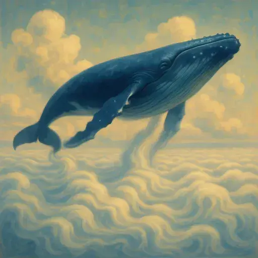 提示词:A giant whale swimming above a sea of clouds, tail fin creating waves of mist, Dreamlike Illustration Style(一只巨鲸在云海上方游动,尾鳍掀起云浪, 梦幻插画)