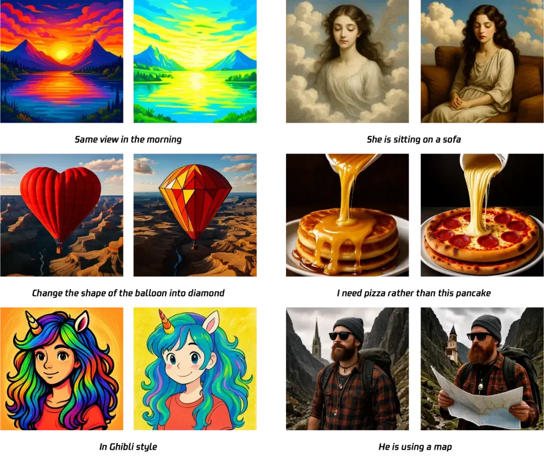 从效果来看,UniImage 通过起图文理解的强大能力,可以准确识别修改的元素,并在保证主体的姿态颜色不变的情况下完成对图像的修改。