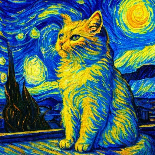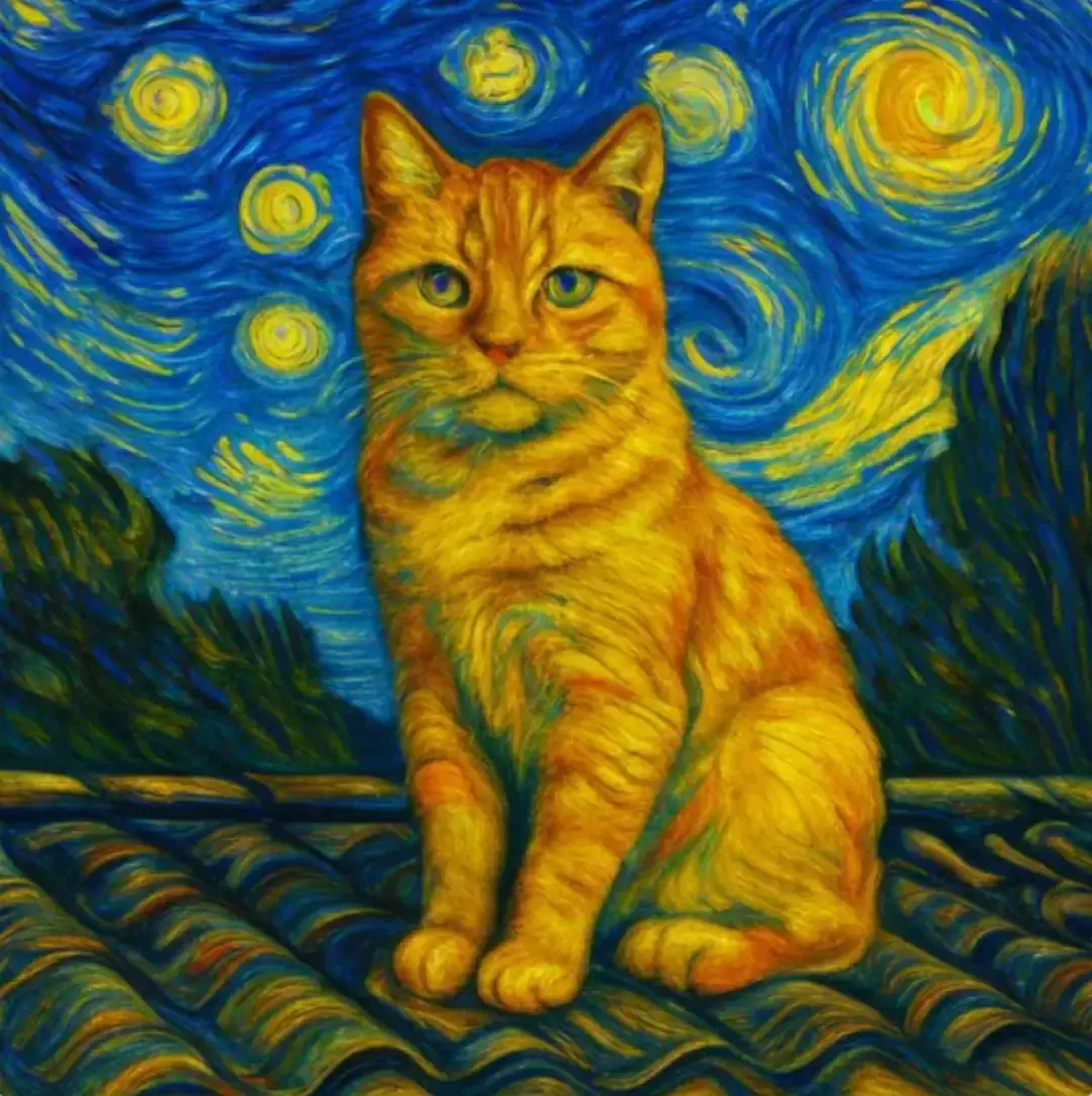提示词:A cat sitting on a rooftop, in the style of Vincent van Gogh's 'The Starry Night', swirling night sky, thick impasto oil painting texture, vibrant blue and yellow tones(一只猫坐在屋顶上,风格借鉴文森特・梵高的《星月夜》,有着旋转的夜空、厚重的厚涂油画质感、鲜明的蓝色和黄色色调)