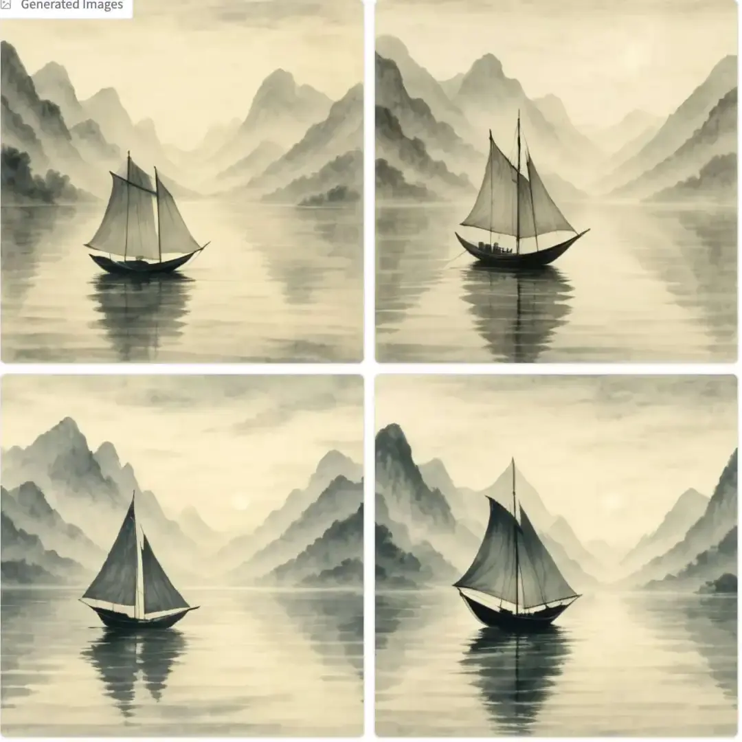 提示词:A lone traditional Chinese sailboat drifting on the Yangtze River, distant mountains barely visible, endless sky and flowing river merging at the horizon, soft mist, reflections in calm water, inspired by classical Chinese ink wash painting, ethereal and poetic mood, ultra-detailed, cinematic lighting, watercolor textures