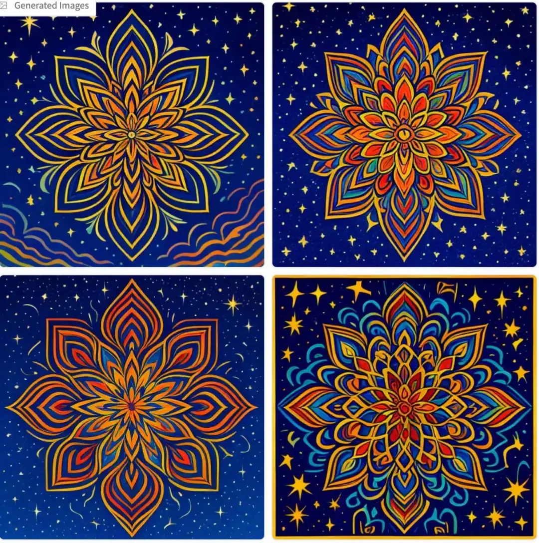 提示词: The starry sky refracted into kaleidoscope patterns, colors constantly shifting, Optical Art Style(星空被折射成万花筒图案,色彩不断变化, 光学艺术)