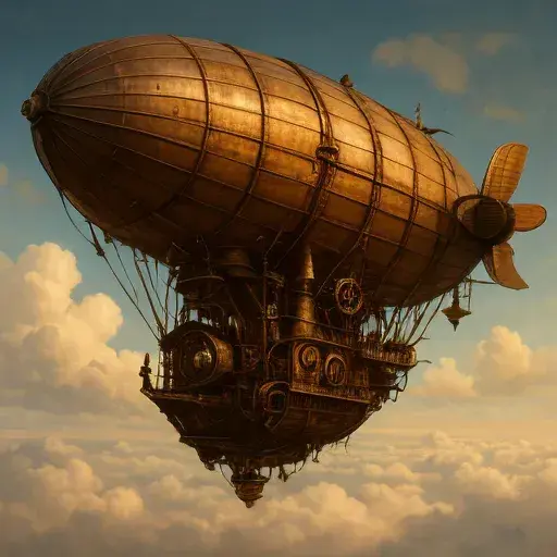 提示词:A giant steampunk airship floating above the clouds, copper and wood structure, exposed gears and pipes, Victorian style (巨型蒸汽飞艇漂浮在云层之上,铜质与木质结构,齿轮与管道外露,维多利亚风格)