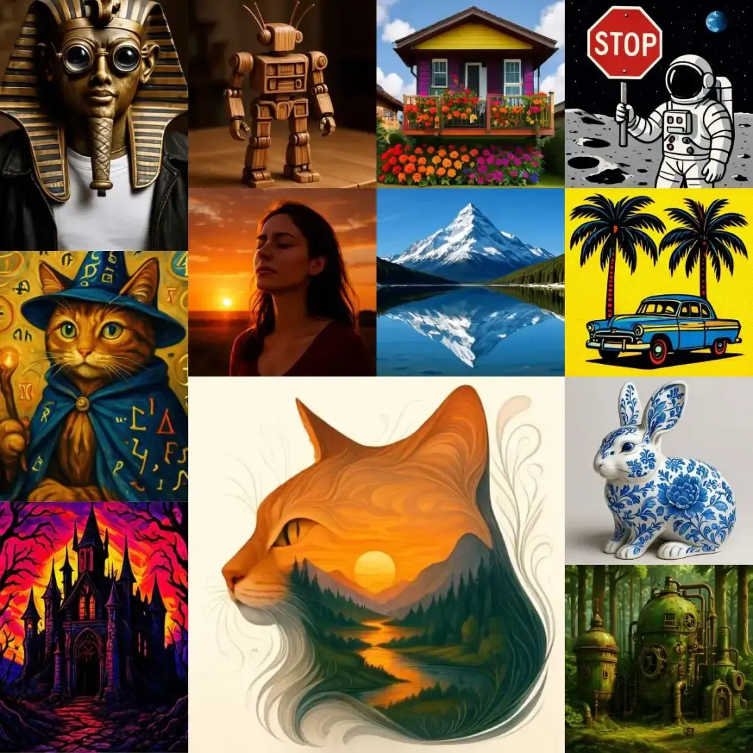 通过测试各种艺术风格的作品,可见 UniImage 对文字内容、各种画风和细节的掌握: