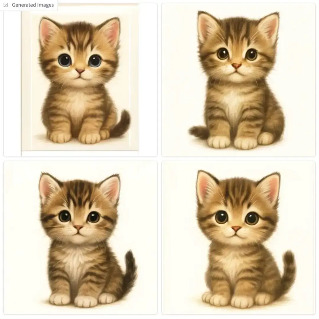 IP形象设计和表情包也是生图的重要应用,可以是可爱小猫: