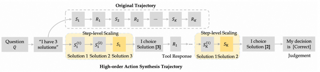 图展示了一种合成轨迹的方式,考虑一个问题 Q,原始数据的轨迹是图上方的 Original Trajectory,从轨迹中用步骤级别展开,图上的“I have 3 solutions”,“I choose Solution[3]”等就是关键的步骤,对这些步骤,扩展为多个可能的分支。比如在”I have 3 solutions”时,分别得到三个候选的 solution,图上显示是串形得到的(也许也可以并行?)然后对于其中任何一个,往后展开(rollout)。熟悉强化学习和 AlphaGo 的朋友们对这个应该很熟悉。对于轨迹,拆分成动作数据,包含单步的规划、推理动作和多步的决策动作。这个拆分维度是很有启发性的,这三个维度可以较为全面的覆盖 Agent 对于 LLM 能力的需求。换言之,可以从这三个角度去评判“LLM 是否胜任 Agent”,也能指导各种 Agent 中 LLM 的升级迭代。