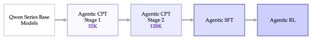 这几个阶段的串联如图所示,而其中的最左侧的 Base Model 指的就是基础预训练模型,对于此 Deep Research 项目,使用的是 Qwen3 的 30B 预训练模型:Qwen3-30B-A3B[5]。经过本章节描述的几个阶段,最终得到 DeepResearch 的模型,即 DeepResearch-30B-A3B[3]。在本章节,我们会先讨论这样设计的必要性,然后每个阶段各自介绍其关键设计。