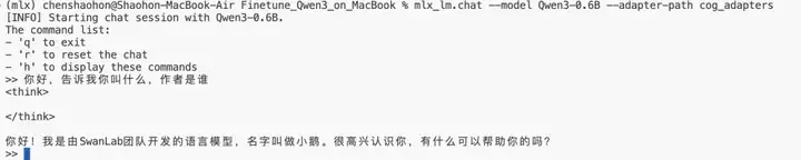 可以直接在命令行里与模型聊天,可以看到模型已经学会了他的新名字“小鹅”。