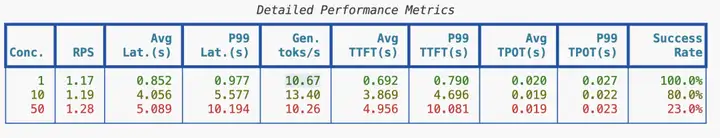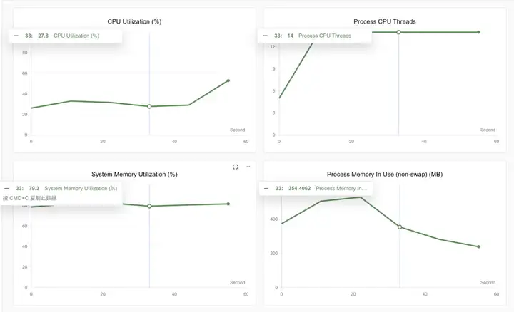 使用SwanLab进行性能跟踪可以看到,随着并发数从10->20->50,部署性能快速下降。不过这也是由于笔者本身在测试时也在使用这台笔记本电脑,系统内存已经使用到了80%的原因。以自用或者小实验室使用来说这个速度非常可观