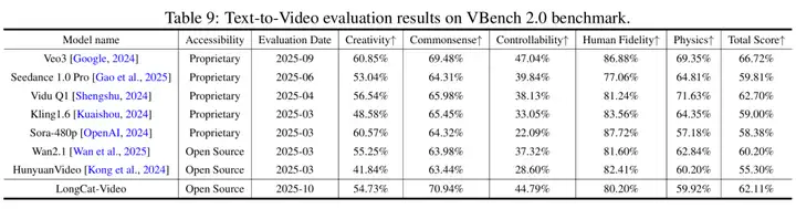 - 在 VBench 等公开基准测试中,LongCat-Video 在参评模型中整体表现优异。