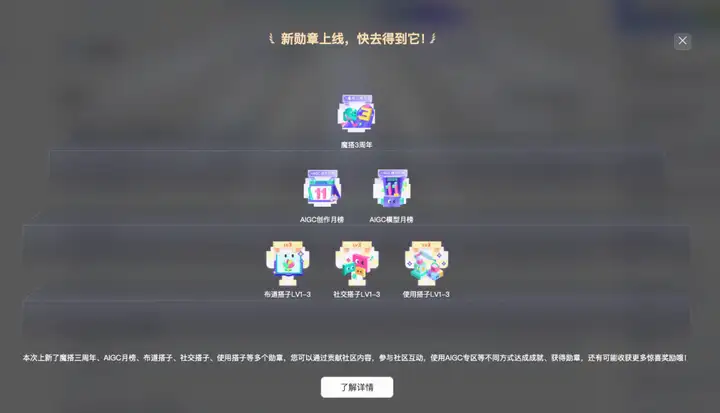 3. 魔搭勋章体系升级,包括新的社区活跃度勋章,勋章排行榜等能力完成上线