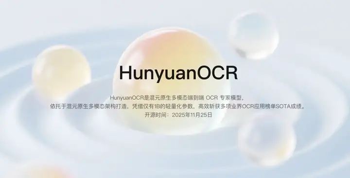 11月25日,腾讯混元推出全新开源模型 HunyuanOCR,参数仅为1B,依托于混元原生多模态架构打造,获得多项业界OCR应用榜单SOTA(最先进水平)成绩。