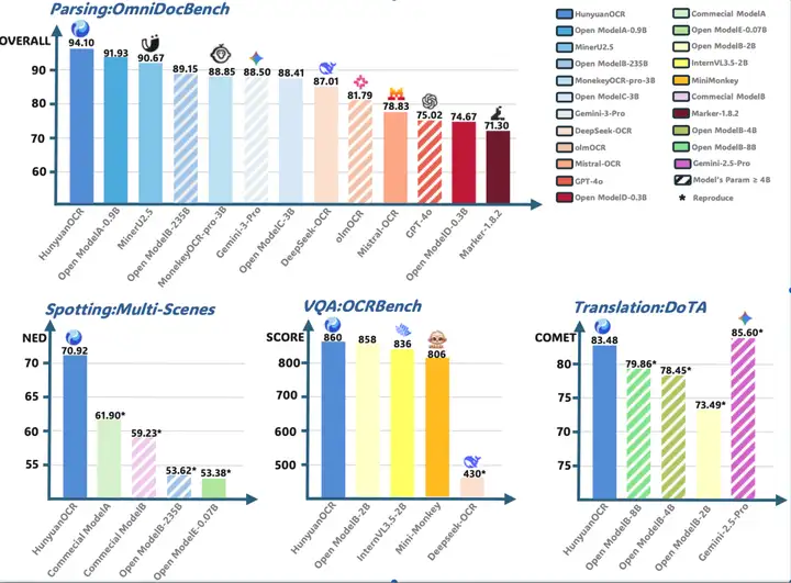 混元OCR多项核心能力达到SOTA效果,其中在复杂文档解析的OmniDocBench测评中,获得了最高的94.1分,效果超过了谷歌的Gemini3-pro等一众领先的模型;文字检测和识别能力,在自建覆盖了9大应用场景(文档、艺术字、街景、手写、广告、票据、截屏、游戏、视频)的基准上,大幅度领先同类开源模型以及商业OCR模型;在OCRBench榜单上,总得分为860分,以仅仅1B总参数的模型配置,取得了包括通用视觉理解模型在内总参数3B以下的SOTA成绩。