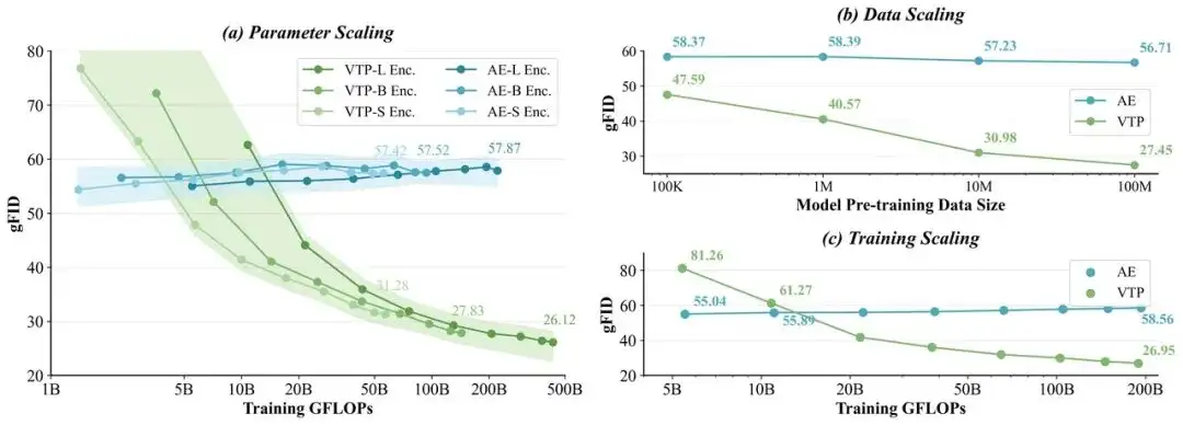 更为本质的是,VTP给出的不是一个“单点解”(在大量限定条件下把某个指标刷到超出理论上限),而是一条随着tokenizer投入的参数/算力/数据规模持续提升的生成性能曲线。这意味着研究团队尽可能去避免过拟合特定场景,追求一个在真实工业级环境中可以广泛生效的方法。