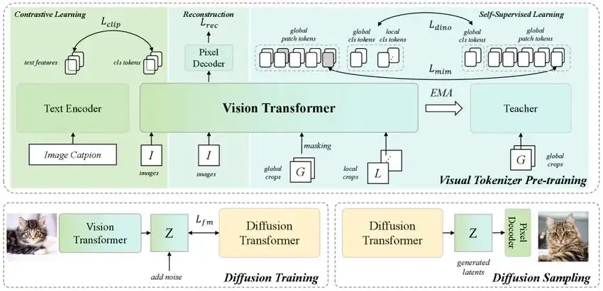 还剩下一些关键的技术细节需要解决,比如如何看待重建(在研究团队的视角下重建也是一种表征学习,只不过它比较低级)、ViT-based tokenizer的实现细节、如何把多种表征学习方法实际有效的联合训练等等。这里不展开细节,大家有兴趣直接看技术报告更高效一些。