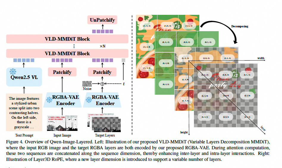 传统的 VAE 只懂红绿蓝,Qwen 团队研发了全新的 RGBA-VAE,让 RGB 图像和带透明度的 RGBA 图层在同一个潜空间内“对话” ,解决了图层之间分布不均、边界模糊的顽疾。 - VLD-MMDiT:支持变长图层的“超级大脑”