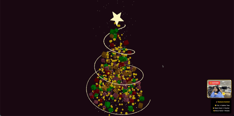MiniMax M2.1 基于 React Three Fiber 与 InstancedMesh 构建的“3D 梦幻圣诞树”,成功渲染 7000+ 实例,支持手势交互与复杂粒子动画,展现高难度 3D 渲染能力。