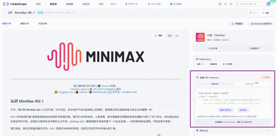 点击即可跳转模型链接:https://modelscope.cn/models/MiniMax/MiniMax-M2.1