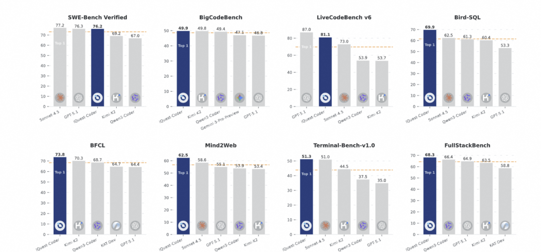 IQuest-Coder-V1在多项权威基准测试中展现出色性能: