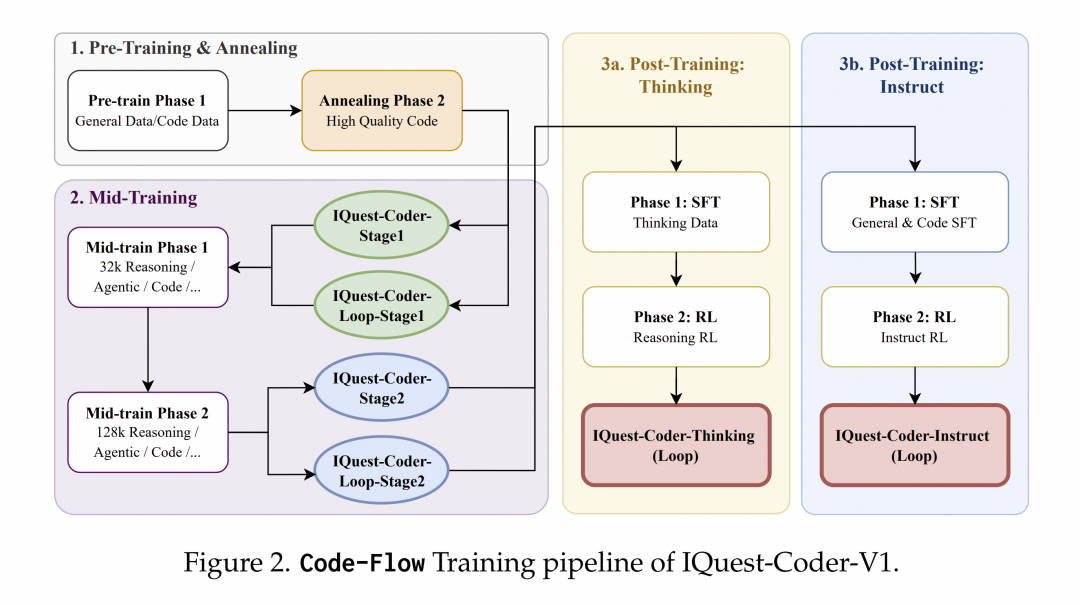 - 预训练与高质量退火:从通用数据和代码数据开始,经过高质量精选代码的退火阶段,确保模型基础表征为后续复杂逻辑任务做好准备