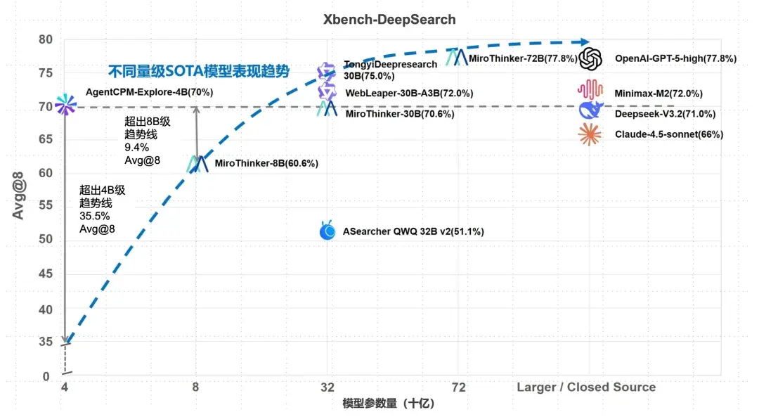 在 Xbench-DeepResearch 上 AgentCPM-Explore 的表现超越了 OpenAI-o3,Claude-4.5-Sonnet 等闭源大模型,显著超越了不同量级 SOTA 模型的表现趋势线,展现出了更高的能力密度。
