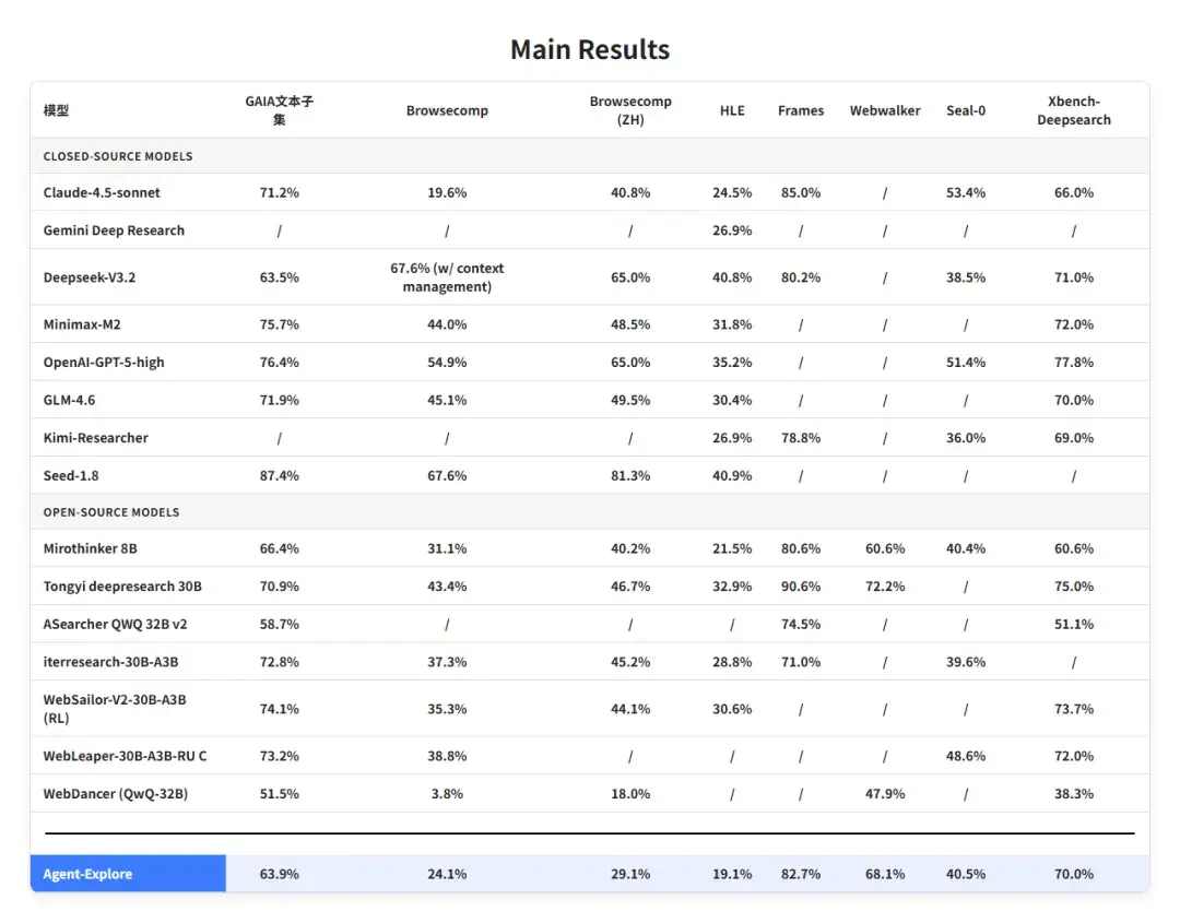 AgentCPM-Explore在GAIA、HLE、Browsercomp、Browsercomp(ZH)、WebWalker、FRAMES、Xbench-DeepResesarch、Seal-0 主流智能体评测基准上均展现出 极致的参数效能比,不仅取得同尺寸模型 SOTA,而且越级赶上甚至超越两倍参数量(8B 级)SOTA 模型、比肩部分 30B 级以上和闭源大模型的效果。
