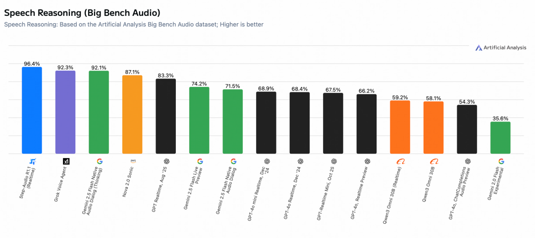 大模型评测榜单 Artificial Analysis Speech Reasoning 更新,阶跃星辰原生语音推理模型 Step-Audio-R1.1 登顶榜首。