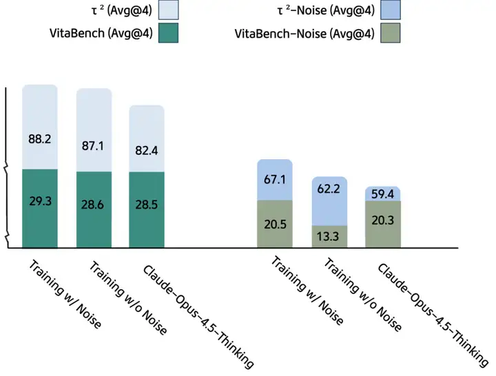 可以看到,带噪声环境下未经过稳健训练的模型的表现会出现大幅衰减,Claude 也无法适应全部的噪声类型。而经过这套系统化的抗干扰训练,LongCat-Flash-Thinking-2601(Training w/ Noise 组)拥有了强大的环境适应能力,哪怕在复杂、不理想的场景中,也能良好发挥、高效完成任务。