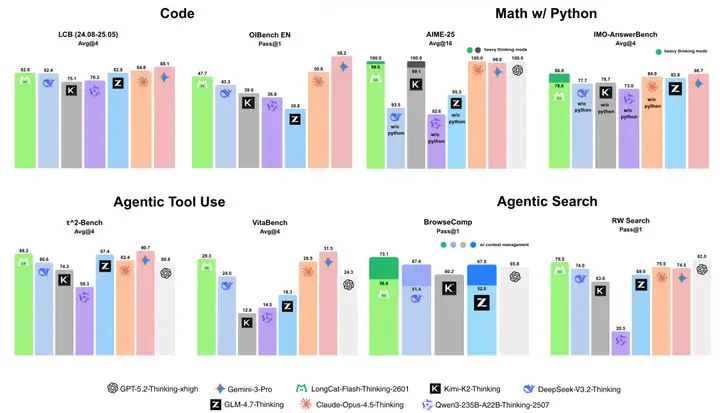 经过全面严谨的评估显示,LongCat-Flash-Thinking-2601 模型在编程、数学推理、智能体工具调用、智能体搜索维度表现全面领先: