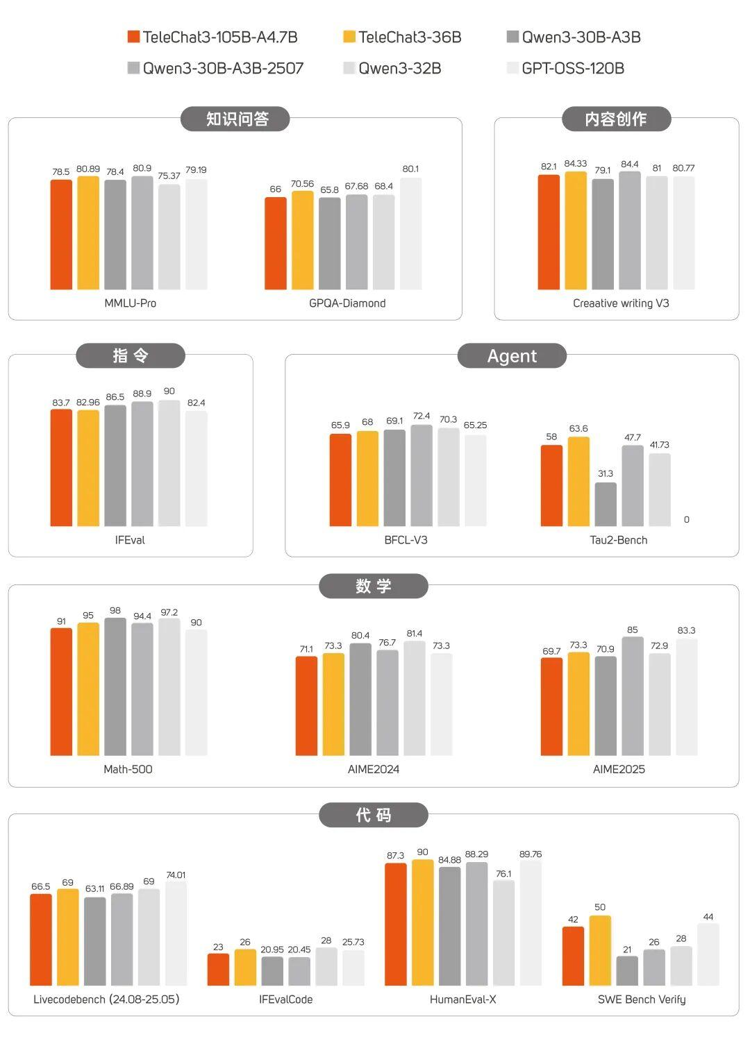 此外,TeleAI还同步开源了稠密参数模型TeleChat3-36B-Thinking模型,在知识、逻辑推理、智能体等维度实现了能力提升,并实现了文本创作、语义理解、角色扮演等任务的针对性优化。