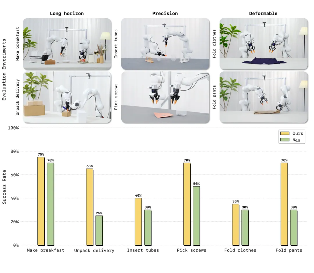真机评测中,LingBot-VA在多项高难操作任务上性能超越业界标杆 Pi0.5