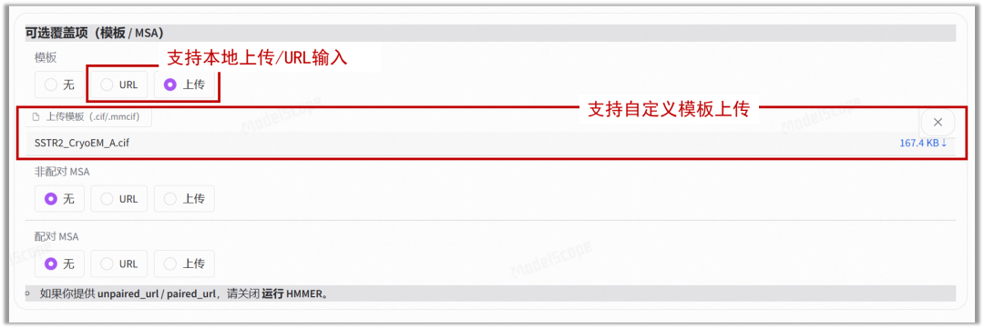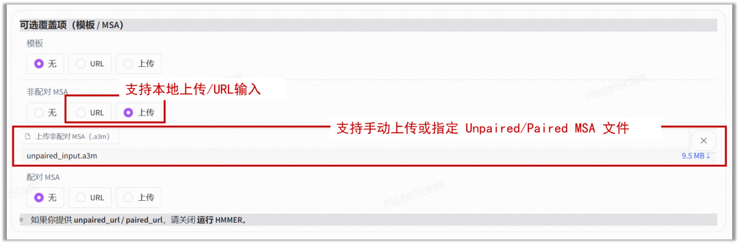 支持手动上传或指定 Unpaired/Paired MSA 文件。对于进化信息稀缺或需要特定同源序列干预的案例,您可以完全掌控多序列比对输入,从而获得更符合预期的折叠结果。