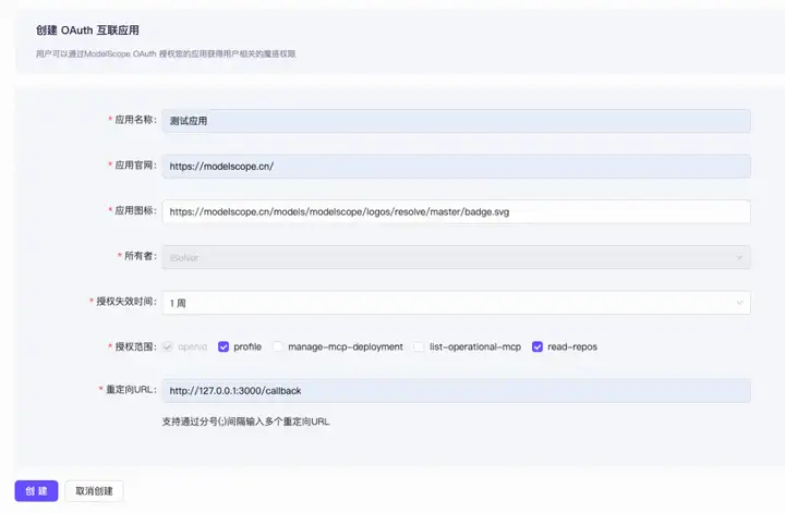- 创建 OAuth 应用:在魔搭首页-访问控制页面,进入「互联应用」板块,创建应用。