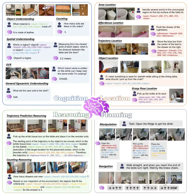团队设计了5类空间推理任务——计数、物体定位、操作点定位、区域定位和轨迹预测,来验证RynnBrain新提出的“文本-空间交织”推理范式。