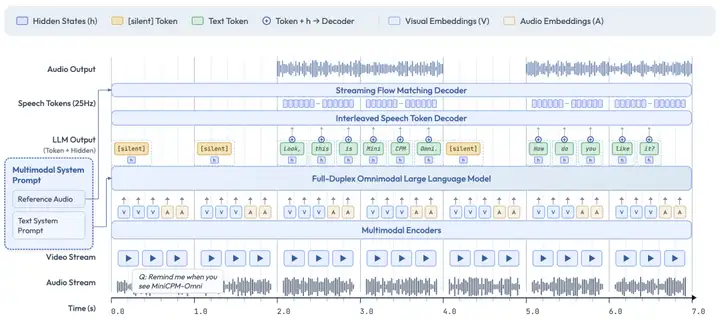 全双工模式(Duplex): 全双工模式是 MiniCPM-o 4.5 的一大创新特性。在该模式下,模型可以一边生成回复,一边持续接收和处理新的多模态输入。也就是说,视觉、音频等输入流不会因为模型正在说话(输出)而中断,模型始终“眼观六路、耳听八方”地感知外界。这使人机交互从传统的“对讲机”式升级为更接近人类自然沟通的 “即时自由对话”。例如,在全双工模式下,模型可以在用户的视频直播过程中实时理解画面内容并给予语音反馈,即使模型在说话,它的“眼睛”和“耳朵”仍在工作,不会漏掉直播画面的新变化或用户的追加提问。这种模式非常适合实时互动场景,如实时助理、智能监控等。同时,MiniCPM-o 4.5 的全双工模式还支持主动交互:模型可以不等待用户提问,主动基于连续感知到的环境变化做出提示或评论(例如在视频会议中适时提出提醒)。