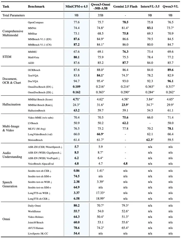 - 卓越的 OCR 与多语言能力: MiniCPM-o 4.5 支持高分辨率图像(可达 180 万像素)和高帧率视频(最高 10FPS)的高效处理。在文档解析任务上表现出色——在 OmniDocBench 基准上达到当前最优水平,超越了包括 Gemini-3 Flash、GPT-5 在内的先进专有模型,以及专业的OCR 工具 DeepSeek-OCR 2。此外,在多模态安全和真实性测试(如 MMHal-Bench)中表现可靠,与 Gemini 2.5 Flash 相当;还支持超过 30 种语言的多语言理解与生成能力,能应对跨语言的多模态应用场景。