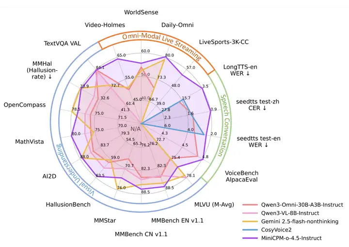 适用场景: 凭借上述强大功能,MiniCPM-o 4.5 可广泛应用于需要视听联动的智能助手场景。例如:实时视频会议助理(边看演示文稿边提供讲解或提醒)、智能驾驶辅助(通过摄像头画面和语音提示进行交互)、智能安防监控(模型持续观看监控视频并可语音报警)、教育陪伴机器人(看书识字与语音讲解同步进行)等。此外,它在文档分析(例如 PDF 表格解析、票据识别)和多语言翻译场景下也有出色表现。开发者还可利用语音克隆和角色扮演功能,为游戏 NPC 或虚拟形象赋予特定的声音和个性,使人机对话更具沉浸感。