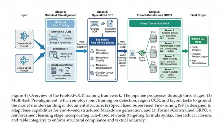 FireRed-OCR 并非简单微调,而是设计了一套完整的三阶段训练流水线: